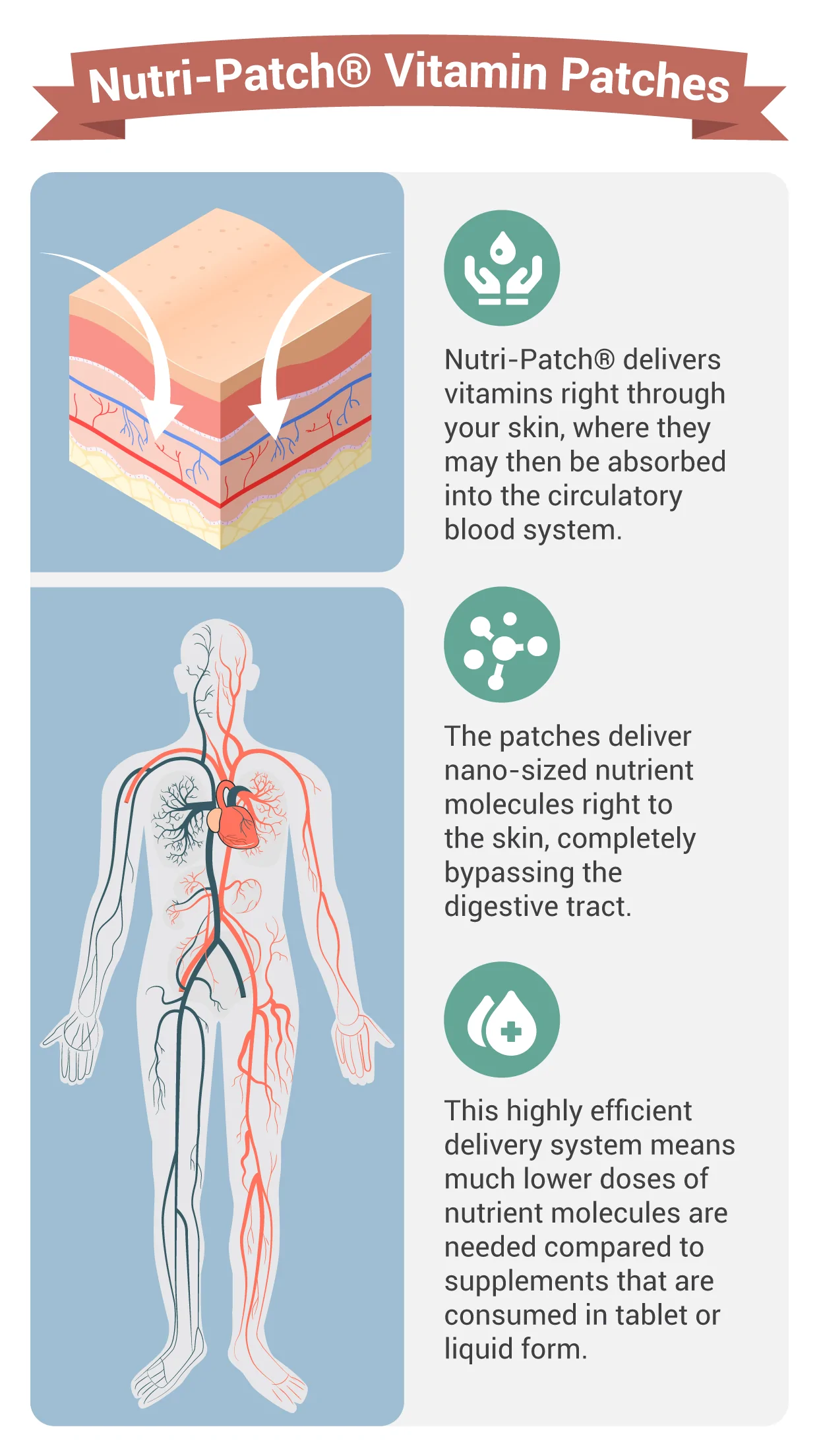 The patch is developed to gradually launch vitamins and minerals into the bloodstream. The nutrients are soaked up through the skin, so they are directly provided to the body's cells. This makes the patch a more efficient way to get all of the nutrients your body requirements, compared to taking numerous supplements orally. The patch also has other advantages over conventional oral supplements, such as being simple to take and convenient for long-lasting use.